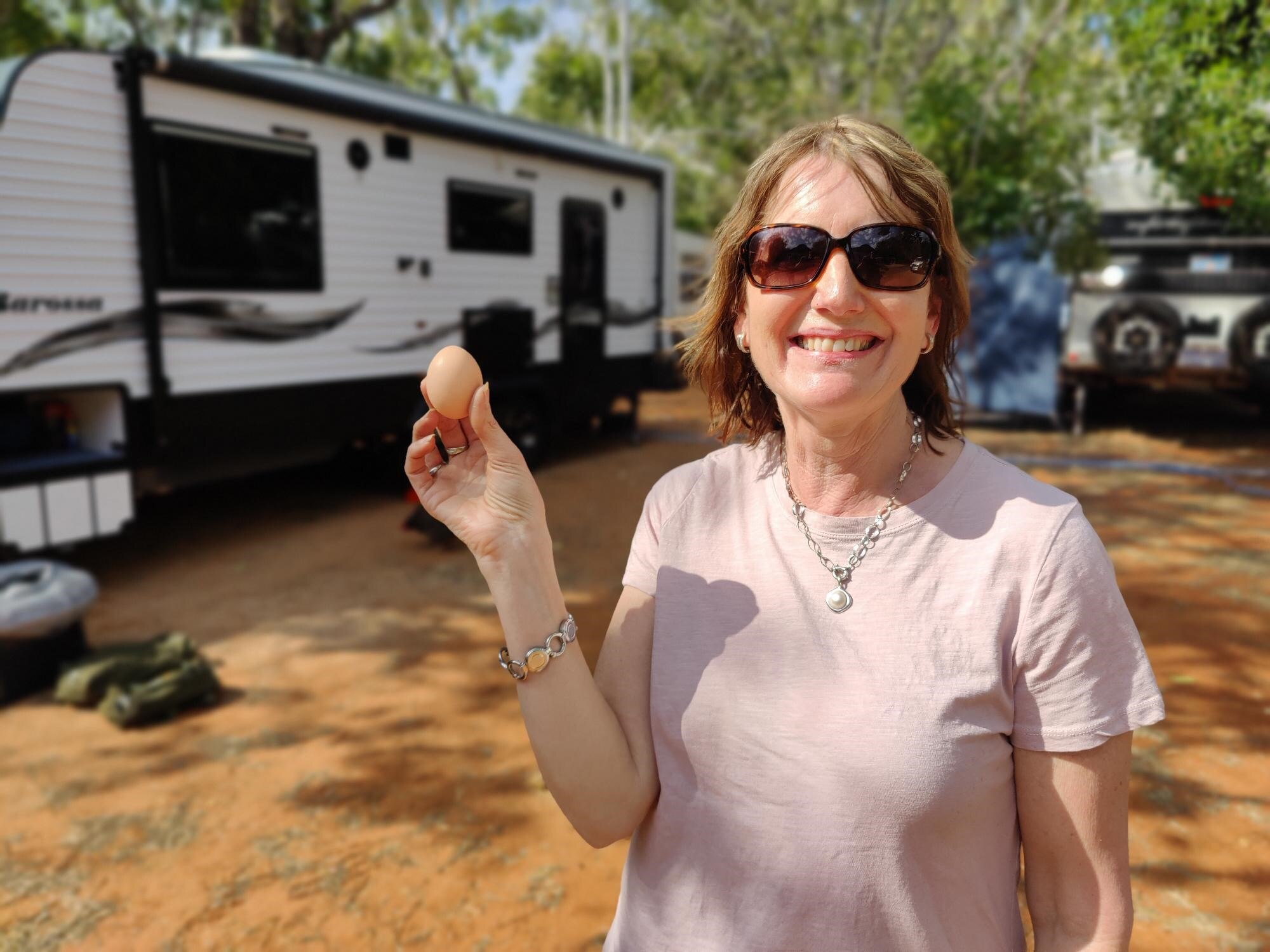 Key points:Cheryl Harman opened the hatch of her caravan after a three-and-a-half-hour journey from Sandfire Roadhouse to Broome to find a chicken and a freshly laid egg inside a storage cupboard in their caravan.